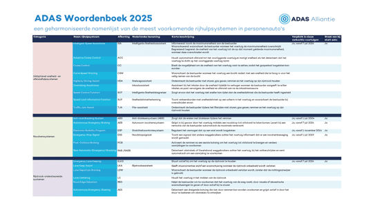 De ADAS Alliantie, waar VNA onderdeel van uitmaakt, heeft de derde update van het ADAS Woordenboek uitgebracht. Dit woordenboek biedt een gestandaardiseerde lijst met termen, afkortingen en beschrijvingen van geavanceerde rijhulpsystemen (Advanced Driver Assistance Systems, ADAS). Het doel is om verwarring te voorkomen die ontstaat door de verschillende benamingen die autofabrikanten hanteren voor vergelijkbare systemen.